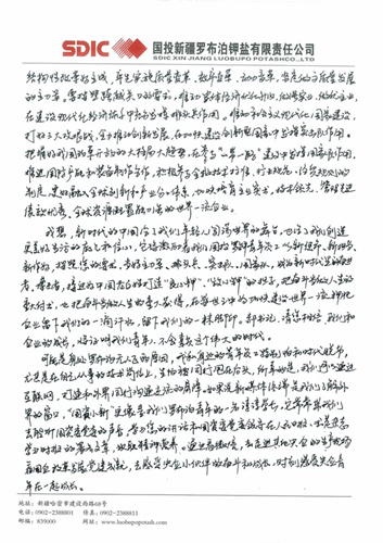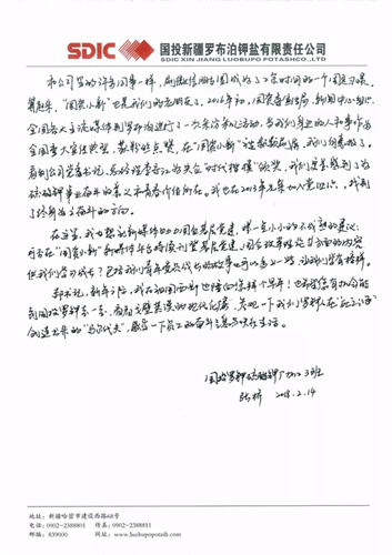 這封寫給郝鵬書記的信,來(lái)自國(guó)投新疆羅布泊鉀鹽有限責(zé)任公司硫酸鉀廠加工車間加工三班的一位普通青年員工。